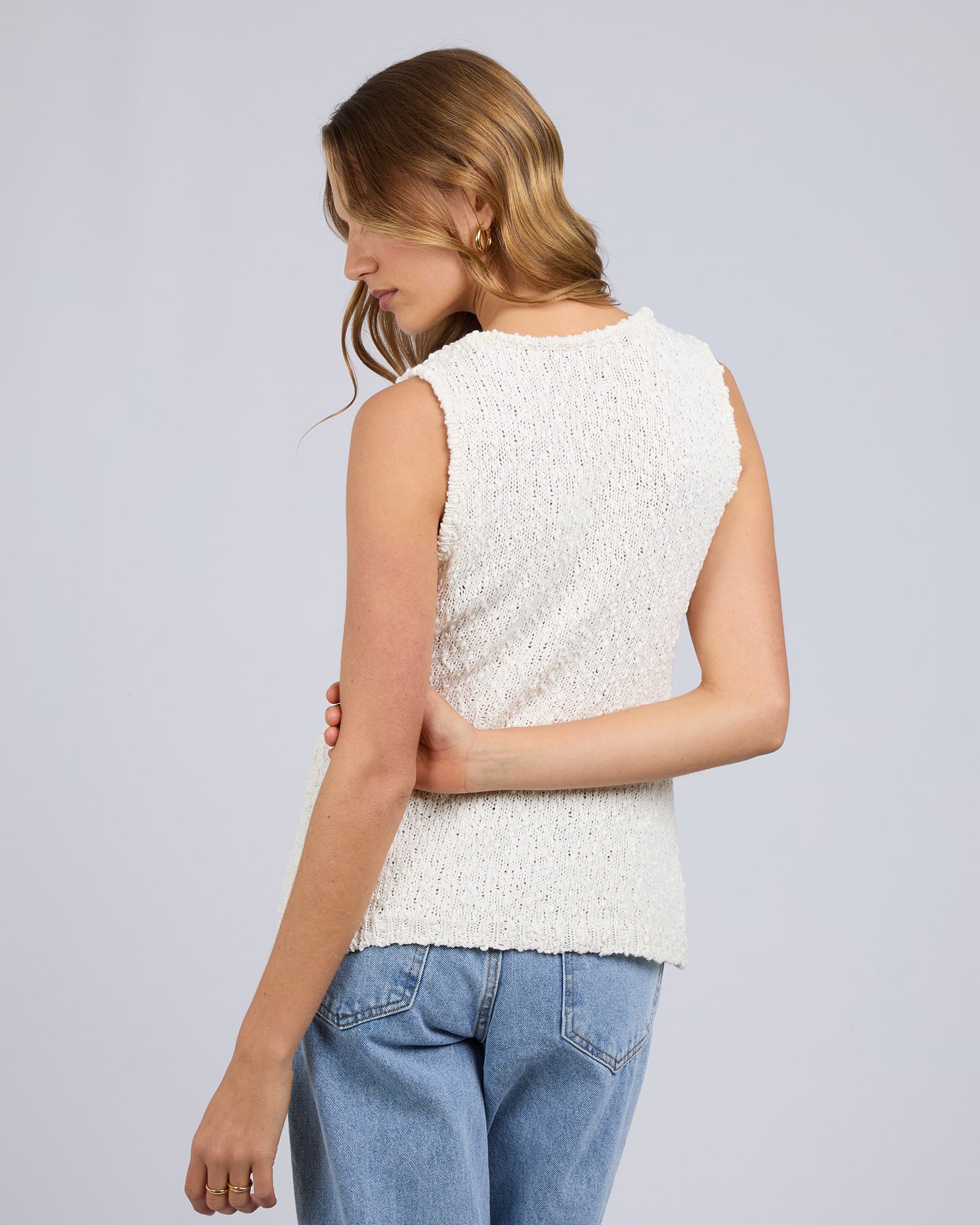 Add some texture to your wardrobe, with our Belle Knit Vest. Made from a textured boucle knit, this vest top features a boatneckline and fixed buttons. Pair back with your favourite denim jorts or with your go to linen pants for the ultimate spring look.